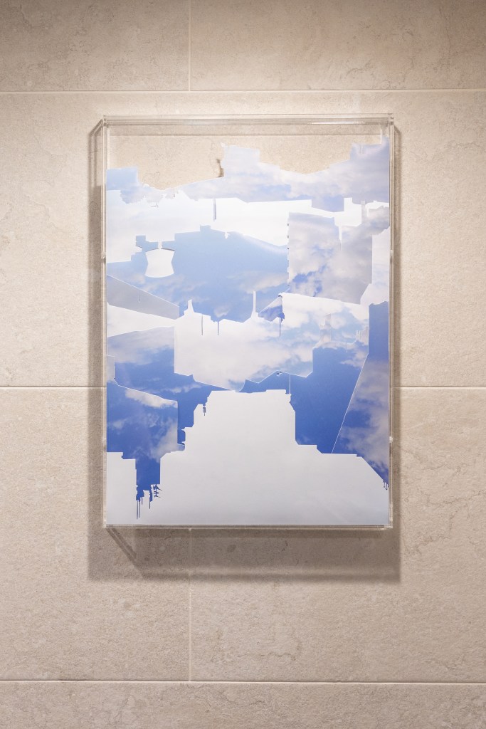 街を歩いている時によく空を見上げる。ただ、大都市で空を眺めることは難しい。立ち止まるかゆっくり歩き、頭を上げなければ空を見ることができない。ビルとビルの間から伸びる空はどこまでも高く伸びていて、そこでは地上とは違うゆっくりとした時間が流れている。ビルと空との境界線で、私たちが暮らす地上という現実空間と空という非現実的空間の境界線は強く。空はビルのアウトラインで切り取られ、街の風景・形は空に反転され、重なり合い建設され続ける都市の風景のを映し出している。